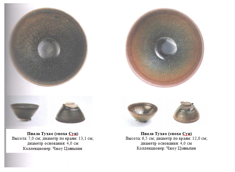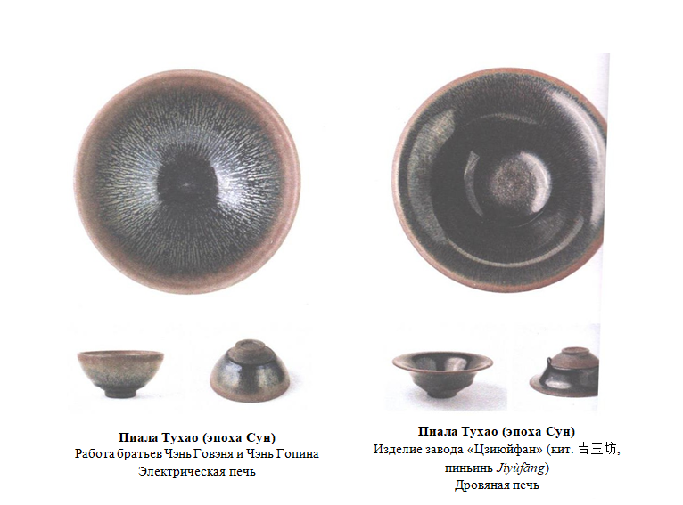 На фото изображены две пиалы Тухао, слева — пиала, обожженная в современной электрической печи, а справа — пиала, обожженная в дровяной печи. Узор на глазури пиалы из электропечи более контролируем, серебристые «шерстинки» — длинные и тонкие, дают небольшое синее сияние, но на краях достаточно отчетливо проступает красный оттенок, являющийся результатом процессов окисления. Что касается дровяной печи, то в одной такой печи можно за один обжиг получить глазурь различных цветов. Применение дровяных печей позволяет создавать поистине прекрасные пиалы Тухао, такие как пиала на фото справа; встречаются подобные пиалы крайне редко.