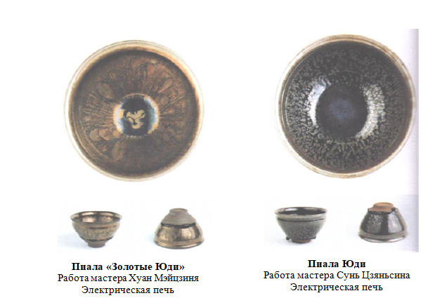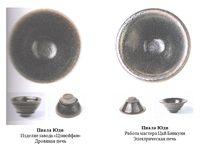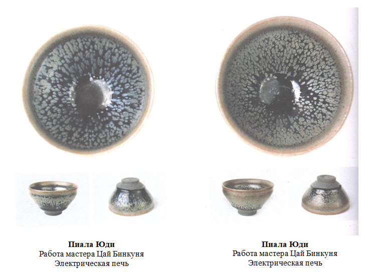 Обе эти пиалы Юди были обожжены в электрической печи, у левой пиалы цвет глазури ближе к синему, а узор в виде «масляных пятен» немного размытый; у правой же пиалы «масляные капли» более круглые и отчетливые, а под воздействием заваренного в пиале чая со временем у нее может проявится красивый эффект радужного семицветного сияния.