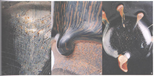 Левая пиала на фото имеет форму «Лянькоу, из-за чего напоминает буддийскую чашу для подаяний, чаще всего такие пиалы использовались в буддийских монастырях. На внутренних стенках проступает серо- серебристый слой из окислившихся металлов, что дает богатый цвет, которым глаз не пресыщается, а также тонкий протяженный отчетливый узор. У правой пиалы цвет переходит от красно-коричневого на внешней стороне к золотистому посередине и синему на внутренней стороне, отчего пиалу называют «трехцветной»