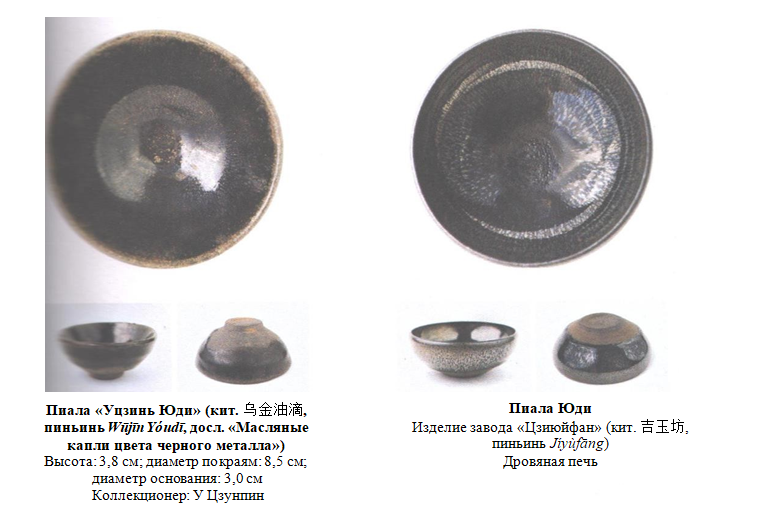 Обе изображенные пиалы являются прекрасными образцами пиал Юди формы «Лянькоу». Для изготовления пиалы на левом фото использовалась толстая глина, «масляные капли» различимы лишь местами. На правом фото изображена современная пиала Юди, обожженная в дровяной печи.